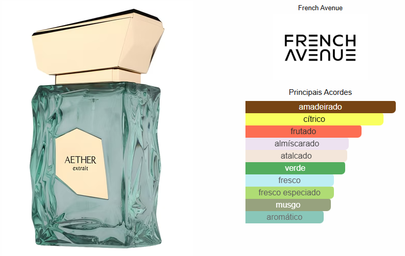 Aether de French Avenue é um perfume Aromático Frutado Compartilhável. Esta é uma nova fragrância. Aether foi lançado em 2024. As notas de topo são: Maçã Verde, Bergamota e Mandarina. As notas de coração são: Cedro, Petitgrain, Cashmeran e Violeta. As notas de fundo são: Almíscar, Musgo de Carvalho e Madeira de Âmbar.