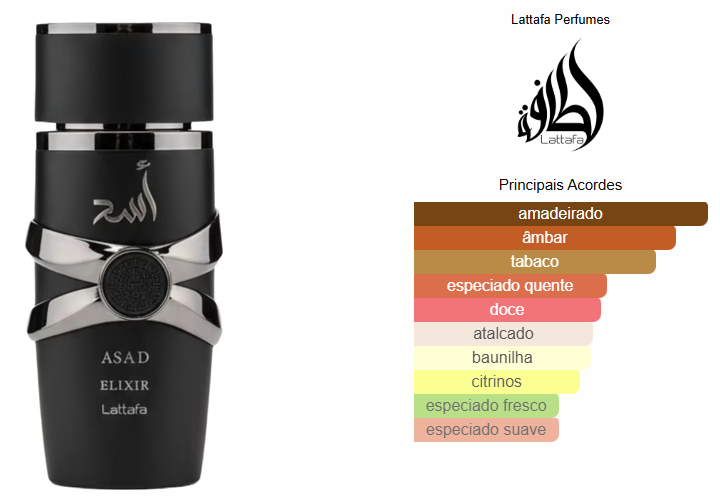 Asad Elixir de Lattafa Perfumes é um perfume Oriental Masculino. Esta é uma nova fragrância. Asad Elixir foi lançada em 2025. As notas de topo são: Toranja, Açafrão e Pimenta Rosa. As notas de coração são: Tabaco, Cedro e Baunilha. As notas de fundo são: Âmbar Claro, Olíbano, Patchouli e Cashmeran.
