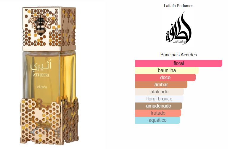 Atheeri de Lattafa Perfumes é um perfume Oriental Floral Feminino. Esta é uma nova fragrância. Atheeri foi lançada em 2025. As notas de topo são: Flor de Maracujá e Gota de Orvalho. As notas de coração são: Orquídea e Jasmim. As notas de fundo são: Baunilha e Madeira de Âmbar.