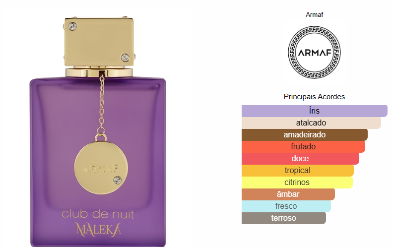Club De Nuit Maleka de Armaf é um perfume Floral Frutado Feminino. Esta é uma nova fragrância. Club De Nuit Maleka foi lançada em 2025. O perfumista que assina esta fragrância é Olivier Cresp. As notas de topo são: Lichia, Bergamota e Pimenta Rosa. A nota de coração é Raíz de Orris. As notas de fundo são: Pralinê, Sândalo e Ambroxan.