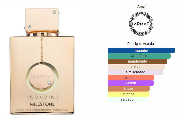 Club de Nuit Milestone de Armaf é um perfume Amadeirado Floral Almiscarado Compartilhável. Club de Nuit Milestone foi lançada em 2019. As notas de topo são: Notas Oceânicas, Frutas Vermelhas e Bergamota. As notas de coração são: Violeta, Madeiras Brancas e Sândalo. As notas de fundo são: Almíscar, Ambroxan e Vetiver.