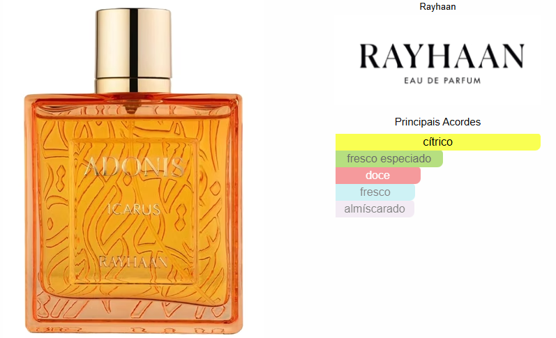 Adonis Icarus de Rayhaan é um perfume Cítrico Aromático Masculino. Esta é uma nova fragrância. Adonis Icarus foi lançado em 2025. As notas de topo são: Laranja, Mandarina e Bergamota. As notas de coração são: Néroli, Gengibre e Pimenta Rosa. As notas de fundo são: Âmbar Cinzento, Almíscar e Vetiver