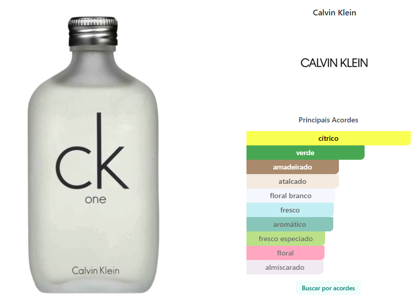 CK One de Calvin Klein é um perfume Cítrico Aromático Compartilhável. CK One foi lançado em 1994. CK One foi criado por Alberto Morillas e Harry Fremont. As notas de topo são: Limão, Notas Verdes, Bergamota, Mandarina, Abacaxi, Cardamomo e Mamão Papaia. As notas de coração são: Lírio-do-Vale, Jasmim, Violeta, Rosa, Noz-moscada, Frésia e Raíz de Orris. As notas de fundo são: Acorde Verde, Almíscar, Cedro, Chá Verde, Sândalo, Musgo de Carvalho e Âmbar.