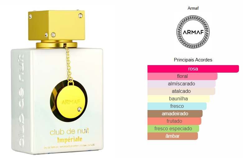 Club de Nuit White Imperiale de Armaf é um perfume Feminino. Club de Nuit White Imperiale foi lançado em 2022. As notas de topo são: Lichia, Bergamota e Noz-moscada. As notas de coração são: Rosa Turca, Baunilha, Almíscar e Peônia. As notas de fundo são: Baunilha, Incenso, Cashmeran e Cedro.