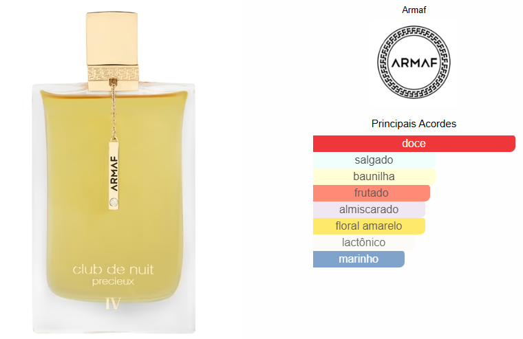 Club de Nuit Precieux IV de Armaf é um perfume Floral Frutado Gourmet Feminino. Esta é uma nova fragrância. Club de Nuit Precieux IV foi lançada em 2025. O perfumista que assina esta fragrância é Vanessa Prudent. As notas de topo são: Sal Marinho, Bergamota e Maçã. As notas de coração são: Bagas Vermelhas, Ylang Ylang, Lírio branco e Jasmim. As notas de fundo são: Chantilly, Almíscar, Fava Tonka, Patchouli e Baunilha