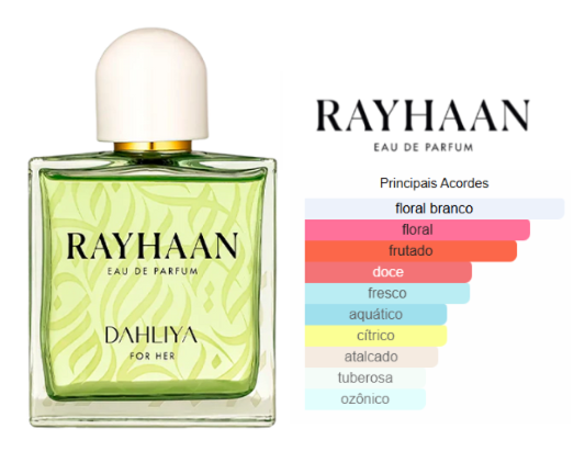 Dahliya de Rayhaan é um perfume Floral Frutado Feminino. As notas de topo são: Pera, Melão, Magnólia, Pêssego, Mandarina e Bergamota. As notas de coração são: Jasmim, Lírio-do-Vale, Tuberosa, Frésia, Rosa, Orquídea, Violeta e Ameixa. As notas de fundo são: Almíscar, Baunilha, Cedro e Amora.