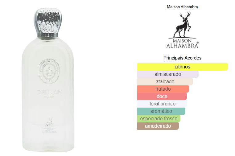 Delilah Blanc de Maison Alhambra é um perfume Floral Frutado Feminino. Delilah Blanc foi lançada em 2024. As notas de topo são: Bergamota, Pêssego Branco e Mandarina. As notas de coração são: Flor de Laranjeira e Vetiver. As notas de fundo são: Almíscar e Baunilha.
