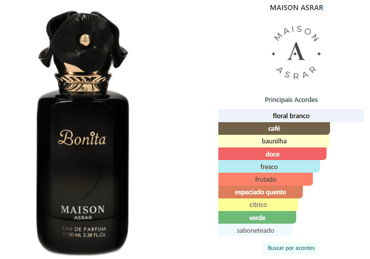 Bonita de MAISON ASRAR é um perfume Chipre Floral Feminino. Bonita foi lançado em 2024. As notas de topo são: Lírio-do-Vale, Flor de Laranjeira e Pera. As notas de coração são: Café e Jasmim. As notas de fundo são: Baunilha e Almíscar.