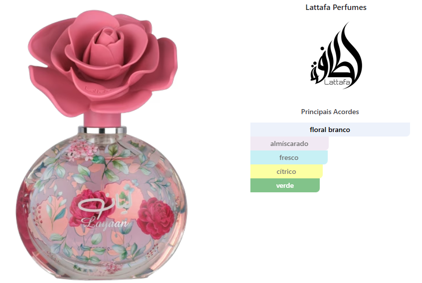 Layaan de Lattafa Perfumes é um perfume Floral Frutado Feminino. Esta é uma nova fragrância. Layaan foi lançado em 2025. As notas de topo são: Pera Verde e Mandarina. As notas de coração são: Jasmim, Lírio-do-Vale e Gardênia. As notas de fundo são: Almíscar e Cedro.