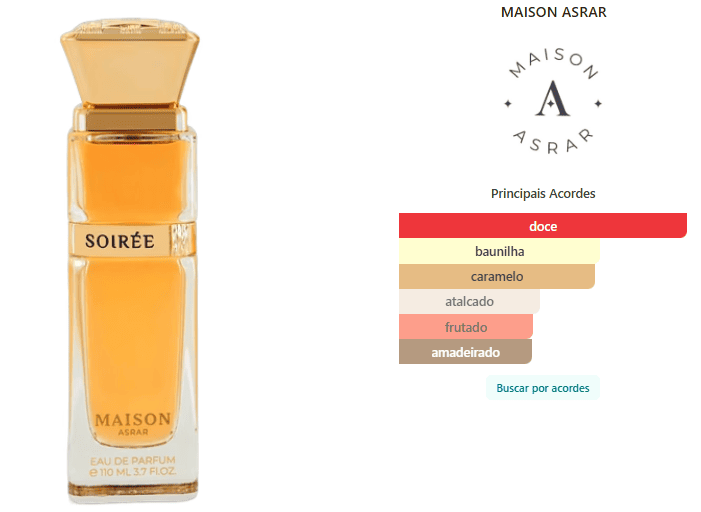 Soirée de MAISON ASRAR é um perfume Floral Frutado Gourmand Feminino. Esta é uma nova fragrância. Soirée foi lançado em 2024. As notas de topo são: Baunilha, Toffee, Pralinê, Maçã e Ameixa. As notas de coração são: Ylang Ylang, Heliotrópio, Flores Brancas e Lavanda. As notas de fundo são: Baunilha, Caramelo, Notas Amadeiradas e Âmbar Cinzento.
