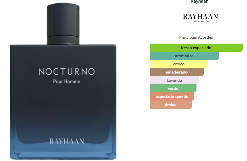 Nocturno de Rayhaan é um perfume Amadeirado Aromático Masculino. Esta é uma nova fragrância. Nocturno foi lançado em 2025. As notas de topo são: Bergamota, Pimenta e Hortelã. As notas de coração são: Lavanda, Pimenta Rosa e Gerânio. As notas de fundo são: Madeira de Âmbar e Cedro.