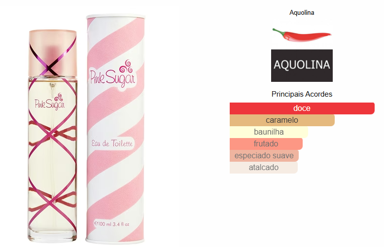 Pink Sugar de Aquolina é um perfume Floral Frutado Gourmet Feminino. Pink Sugar foi lançada em 2004. . As notas de topo são: Framboesa, Laranja, Bergamota e Folha de Figo. As notas de coração são: Algodão-Doce, Alcaçuz, Morango, Bagas Vermelhas e Lírio-do-Vale. As notas de fundo são: Caramelo, Baunilha, Almíscar, Fava Tonka e Sândalo.