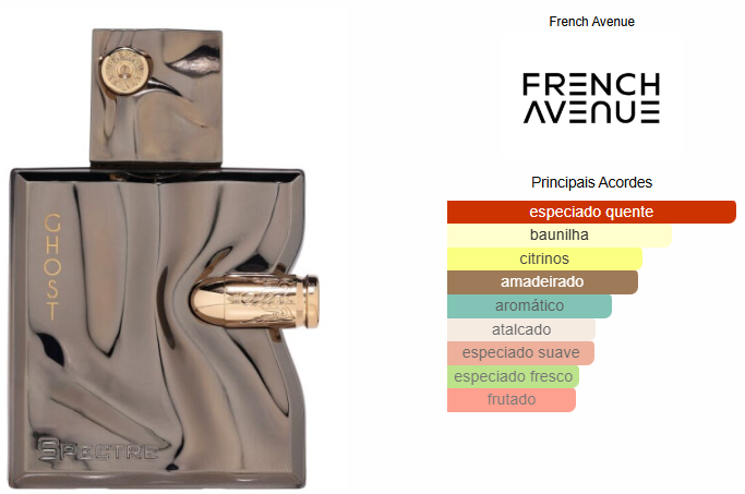 Spectre Ghost de French Avenue é um perfume Amadeirado Aromático Masculino. Esta é uma nova fragrância. Spectre Ghost foi lançada em 2023. As notas de topo são: Gengibre, Bergamota e Cardamomo. As notas de coração são: Groselha Preta, Pimenta Rosa e Rosa. As notas de fundo são: Baunilha, Cedro e Patchouli.