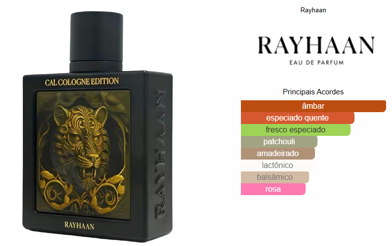 Tiger de Rayhaan é um perfume Amadeirado Especiado Masculino. Esta é uma nova fragrância. Tiger foi lançado em 2025. As notas de topo são: Noz-moscada, Cravo-da-Índia e Limão. As notas de coração são: Leite, Rosa e Davana. As notas de fundo são: Âmbar, Patchouli, Olíbano e Ládano.