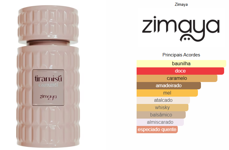 Tiramisu Caramel de Zimaya é um perfume Oriental Baunilha Compartilhável. Esta é uma nova fragrância. Tiramisu Caramel foi lançada em 2024. A nota de topo é Caramelo. As notas de coração são: Mel, Cumarina e Notas Amadeiradas. As notas de fundo são: Baunilha, Whiskey e Almíscar.
