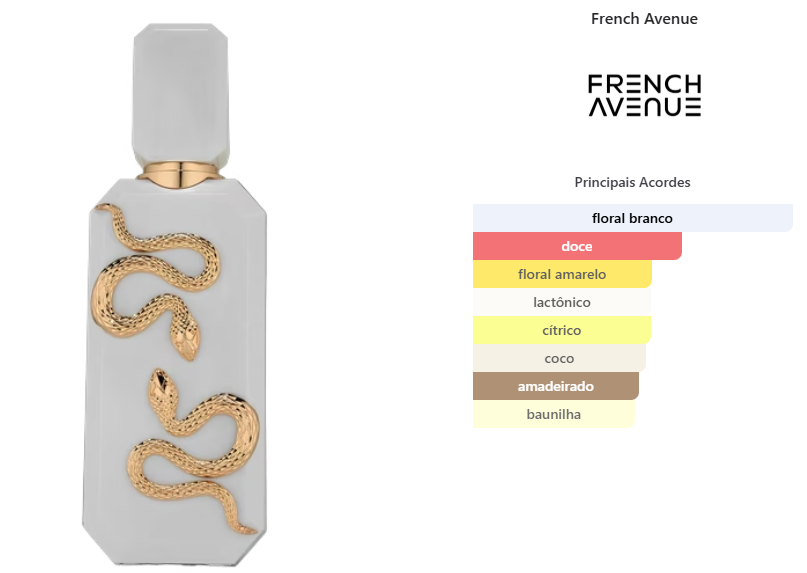 Veneno Bianco de French Avenue é um perfume Floral Compartilhável. Esta é uma nova fragrância. Veneno Bianco foi lançado em 2025. As notas de topo são: Leite, Néroli e Bergamota. As notas de coração são: Flores Brancas, Tiaré e Ylang Ylang. As notas de fundo são: Coco, Baunilha, Ládano e Madeira Guaiac..