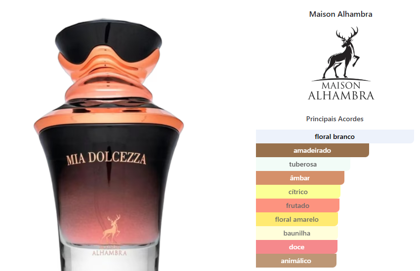 Mia Dolcezza de Maison Alhambra é um perfume Oriental Floral Feminino. Esta é uma nova fragrância. Mia Dolcezza foi lançado em 2025. As notas de topo são: Groselha Preta, Bergamota e Pimenta Rosa. As notas de coração são: Tuberosa, Jasmim, Ylang Ylang e Flor de Laranjeira. As notas de fundo são: Madeira de Cashmere, Baunilha, Âmbar e Madeira Guaiac.