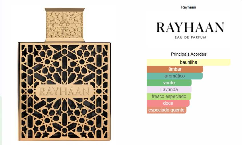 Rayhaan Elixir de Rayhaan é um perfume Oriental Amadeirado Compartilhável. Esta é uma nova fragrância. Rayhaan Elixir foi lançado em 2024. As notas de topo são: Hortelã e Bergamota. As notas de coração são: Lavanda e Benjoim. As notas de fundo são: Baunilha e Fava Tonka.