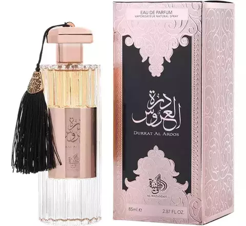 Durrat Al Aroos de Al Wataniah é um perfume Âmbar Feminino. Esta é uma nova fragrância. Durrat Al Aroos foi lançada em 2022. As notas de topo são: Almíscar Branco e Nagarmota ou Óleo de Cipriol. As notas de coração são: Baunilha, Açafrão e Cardamomo. As notas de fundo são: Madeira Guaiac e Cumarina.