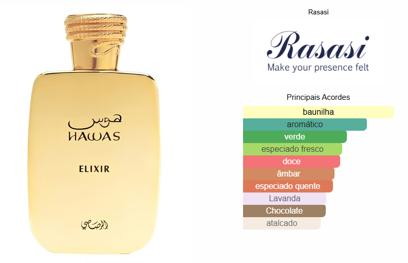 Hawas Elixir de Rasasi é um perfume Oriental Baunilha Compartilhável. Esta é uma nova fragrância. Hawas Elixir foi lançada em 2024. As notas de topo são: Hortelã, Bergamota e Artemísia. As notas de coração são: Chocolate amargo, Lavanda e Benjoim. As notas de fundo são: Baunilha, Fava Tonka e Almíscar Branco.