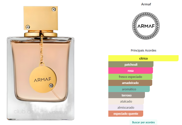 Club de Nuit Woman de Armaf é um perfume Floral Frutado Feminino. As notas de topo são: Laranja, Bergamota, Toranja e Pêssego. As notas de coração são: Rosa, Jasmim, Gerânio e Lichia. As notas de fundo são: Patchouli, Almíscar, Baunilha e Vetiver.
