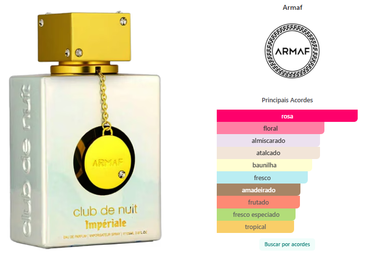 Club de Nuit White Imperiale de Armaf é um perfume Feminino. Club de Nuit White Imperiale foi lançado em 2022. As notas de topo são: Lichia, Bergamota e Noz-moscada. As notas de coração são: Rosa Turca, Baunilha, Almíscar e Peônia. As notas de fundo são: Baunilha, Incenso, Cashmeran e Cedro.