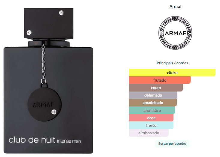 Club de Nuit Intense Man de Armaf é um perfume Amadeirado Especiado Masculino. Club de Nuit Intense Man foi lançada em 2015. As notas de topo são: Limão, Abacaxi, Bergamota, Groselha Preta e Maçã. As notas de coração são: Vidoeiro, Jasmim e Rosa. As notas de fundo são: Almíscar, Âmbar Cinzento, Patchouli e Baunilha.