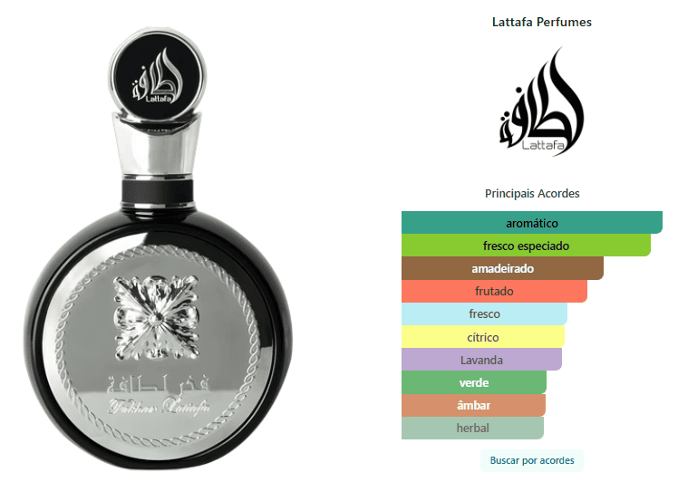 Fakhar Black de Lattafa Perfumes é um perfume Âmbar Masculino. Esta é uma nova fragrância. Fakhar Black foi lançada em 2022. As notas de topo são: Maçã, Bergamota e Gengibre. As notas de coração são: Lavanda, Sálvia, Bagas de Zimbro ou Junípero e Gerânio. As notas de fundo são: Fava Tonka, Madeira de Âmbar, Cedro e Vetiver.