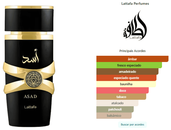 Asad de Lattafa Perfumes é um perfume Oriental Masculino. Asad foi lançado em 2021. As notas de topo são: Pimenta Preta, Tabaco e Abacaxi. As notas de coração são: Patchouli, Café e Íris. As notas de fundo são: Baunilha, Âmbar, Madeira Seca, Benjoim e Ládano.
