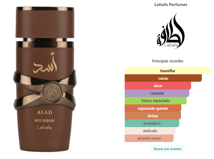 Asad Bourbon de Lattafa Perfumes é um perfume Oriental Especiado Masculino. Esta é uma nova fragrância. Asad Bourbon foi lançado em 2025. As notas de topo são: Lavanda, Ameixa Mirabelle e Pimenta Rosa. As notas de coração são: Cacau, Noz-moscada e Davana. As notas de fundo são: Baunilha de Bourbon, Âmbar e Vetiver.