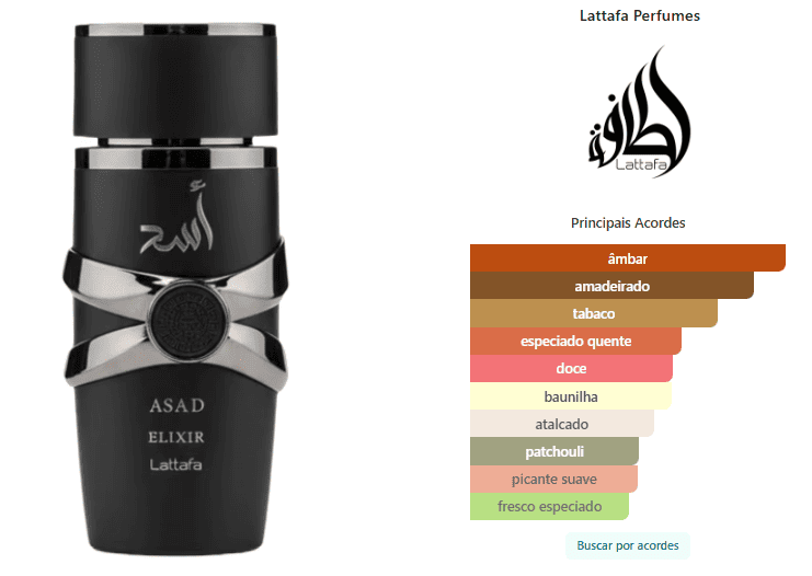 Asad Elixir de Lattafa Perfumes é um perfume Oriental Masculino. Esta é uma nova fragrância. Asad Elixir foi lançado em 2025. As notas de topo são: Pimenta Rosa, Açafrão e Toranja. As notas de coração são: Tabaco, Baunilha e Cedro. As notas de fundo são: Olíbano, Âmbar Claro, Patchouli e Cashmeran.
