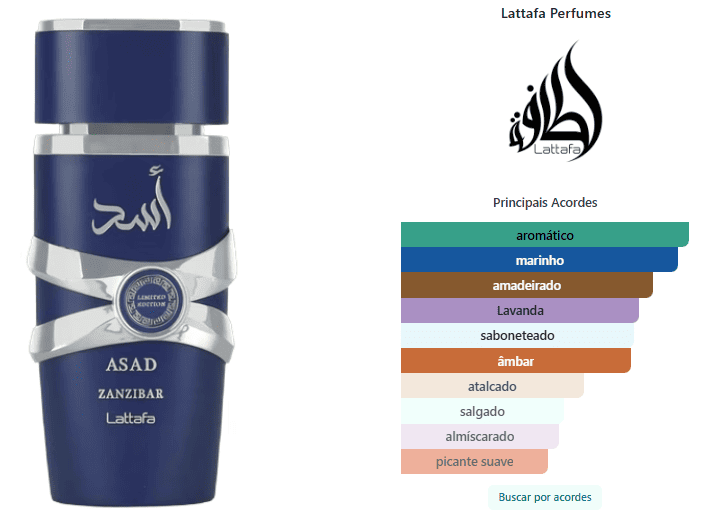 Asad Zanzibar Limited Edition de Lattafa Perfumes é um perfume Oriental Especiado Masculino. Esta é uma nova fragrância. Asad Zanzibar Limited Edition foi lançado em 2025. As notas de topo são: Notas marinhas, Lavanda e Pimenta Rosa. As notas de coração são: Sabão, Cashmeran e Canela. As notas de fundo são: Âmbar, Sândalo, Fava Tonka e Cedro.