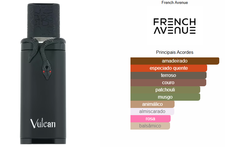 Vulcan Black de French Avenue é um perfume Couro Masculino. Esta é uma nova fragrância. Vulcan Black foi lançada em 2025. As notas de topo são: Açafrão, Canela e Maçã. As notas de coração são: Couro e Rosa. As notas de fundo são: Patchouli, Musgo, Papiro e Almíscar.